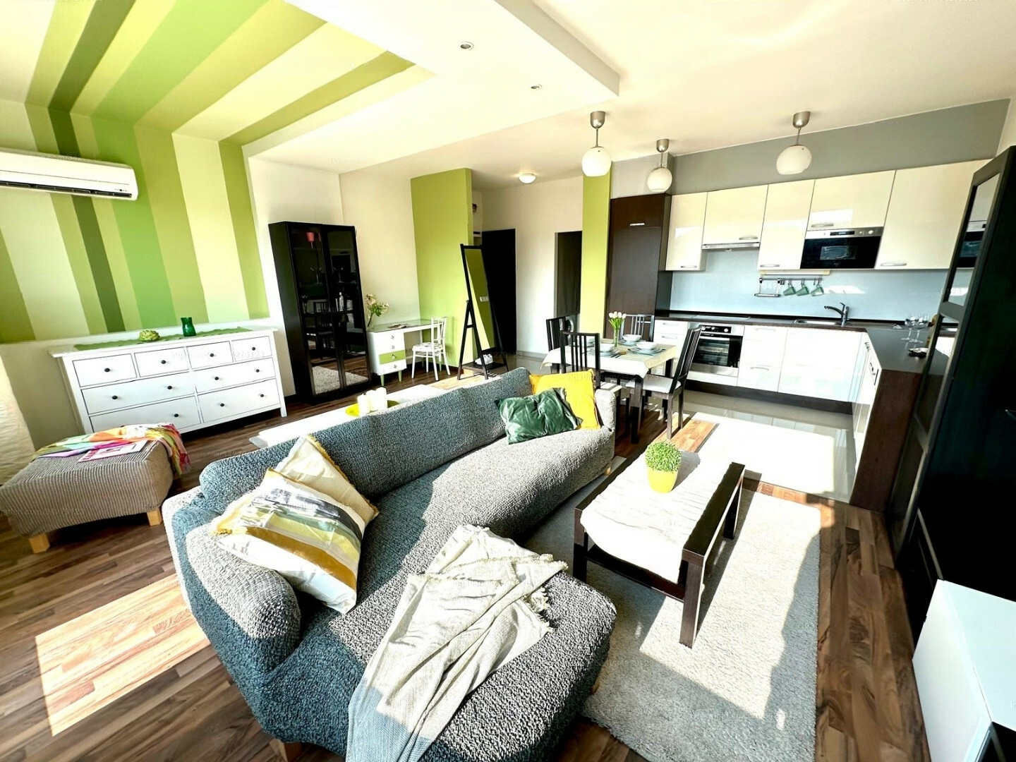 A few years ago, the apartment underwent a complete renovation: new plumbing, heating, and electrical systems were installed. The external and internal windows and doors were replaced, with the exterior windows being five-chamber plastic frames with double-glazed thermal insulation. The heating system is energy-efficient, equipped with a modern condensing boiler, programmable digital radio thermostat, and thermostatic valves on the radiators. An LG air conditioner ensures a pleasant temperature during the summer months. Water meter installation space is prepared for easy setup if needed.