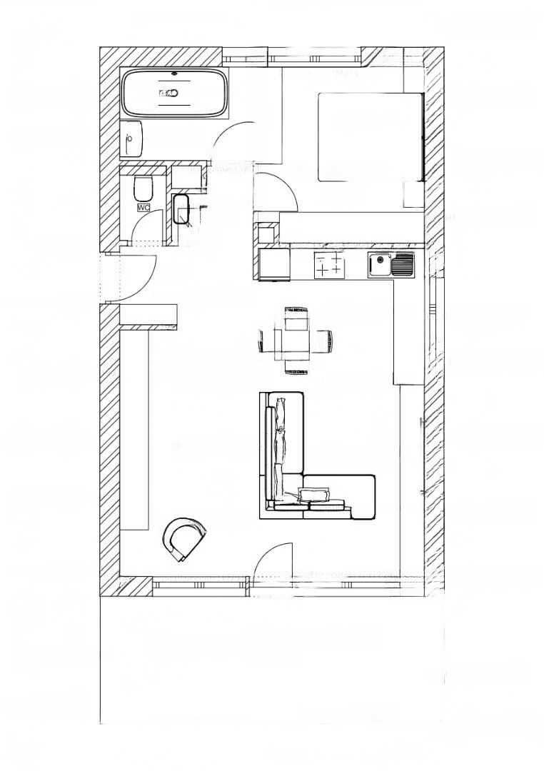 In the bedroom, a custom-made built-in closet, from floor to ceiling, with sliding doors, offers ample storage, while the bathroom features a 190 cm long bathtub, providing the ultimate relaxation.