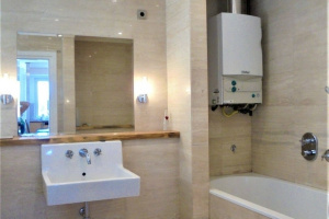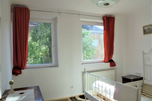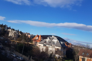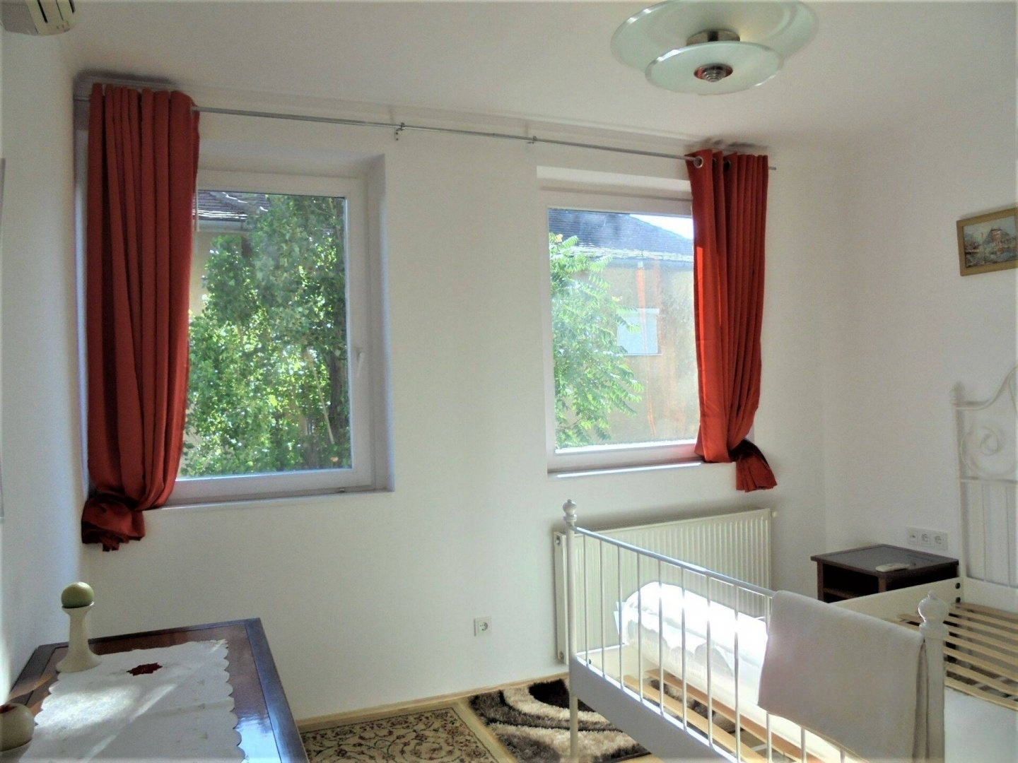 In District II, off Pusztaszeri Road, a two-bedroom apartment on the second floor is available in a ten-unit condominium with a large garden. This building is not a typical Kádár block; the apartments open from a stairwell with windows. The house is secure, with access through double gates.