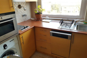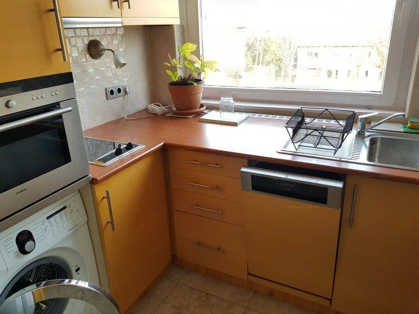 The bedroom and bathroom are located at the back of the apartment. The kitchen is equipped with built-in cabinets, a dishwasher, an oven, and a cooktop. The spacious bathroom has an elegant granite finish. The bedroom window does not face Pusztaszeri Road, making the apartment very bright thanks to its excellent layout. Extras include an alarm system, two air conditioners (one in the living room and one in the bedroom), and a kitchen with an exhaust fan.