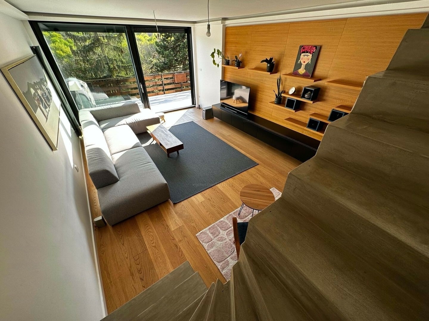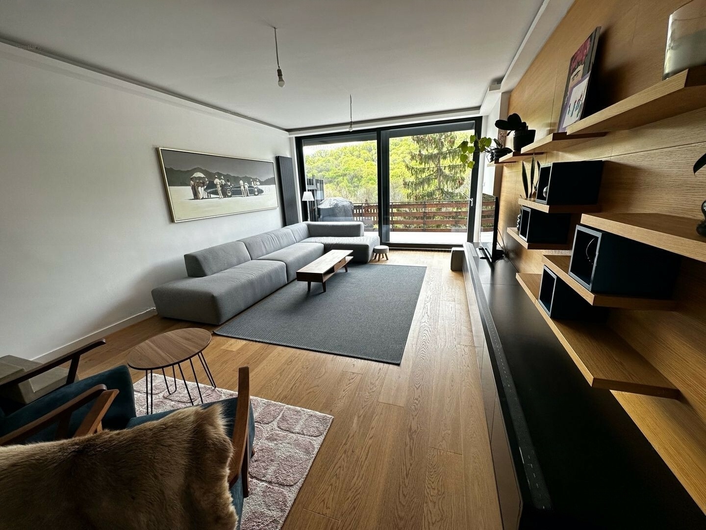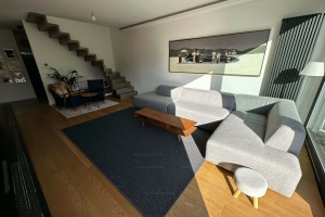 The apartment includes a spacious garage with an electric car charging station and additional storage. There’s also a common storage area for residents.