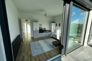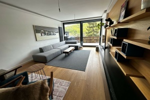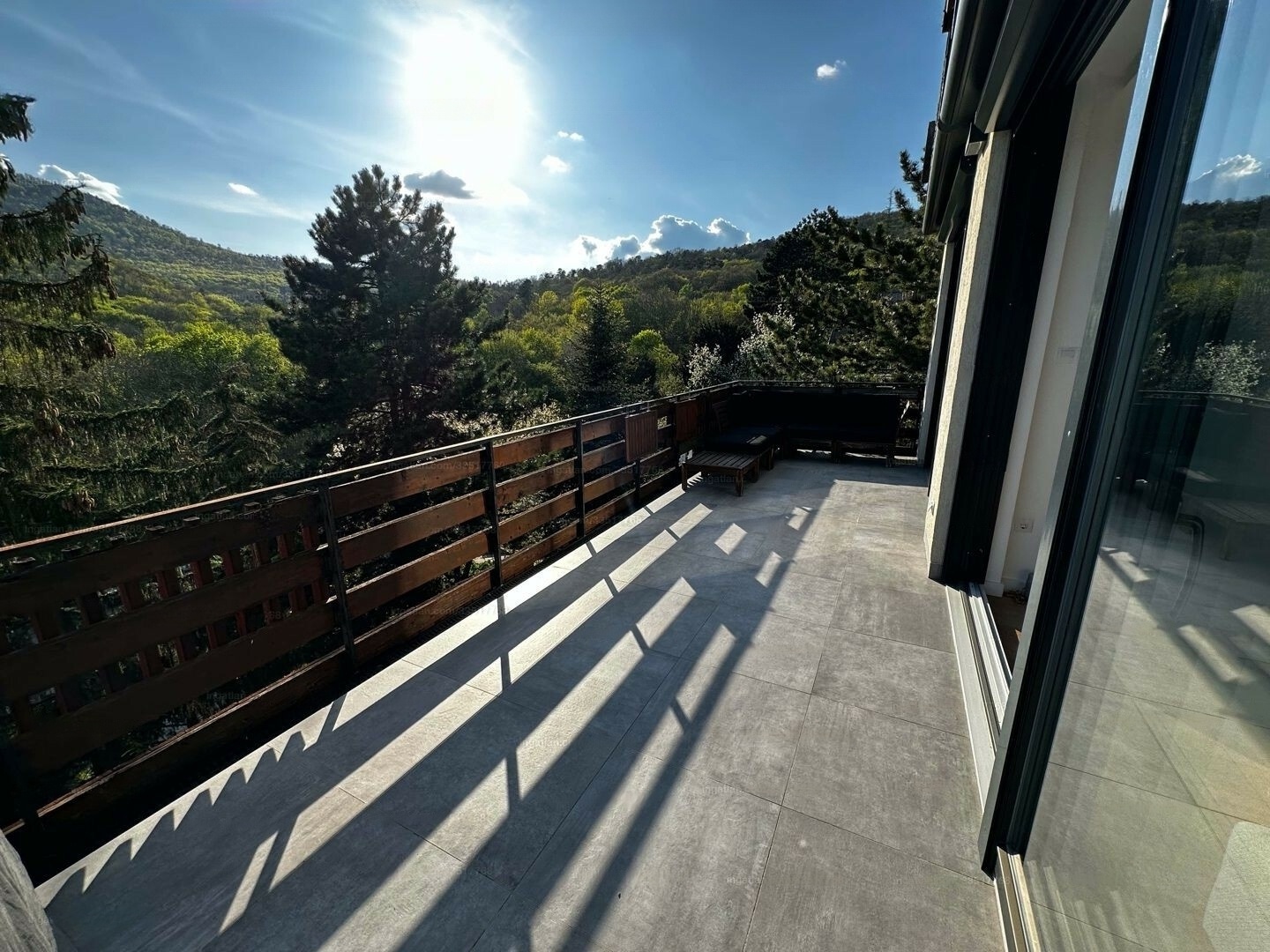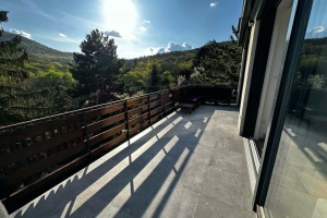 Facing south, the apartment is sunny all day with exceptional views of the surrounding mountains and János Hill lookout. It includes two large terraces (20 m² and 10 m²) and a 50 m² flat roof on the western side, accessible only from this apartment, allowing for additional terrace creation. Full-width floor-to-ceiling windows on the southern facade enhance the views.