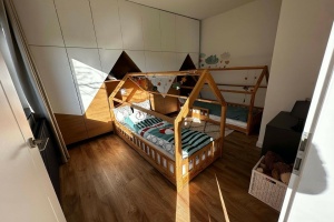 Located on the top (second) floor (no elevator), the apartment features an entrance hall, living room, kitchen, storage, two bedrooms, a bathroom (with shower), and a separate toilet on the lower level. The upper level has two bedrooms and a bathroom (with bathtub) and toilet.