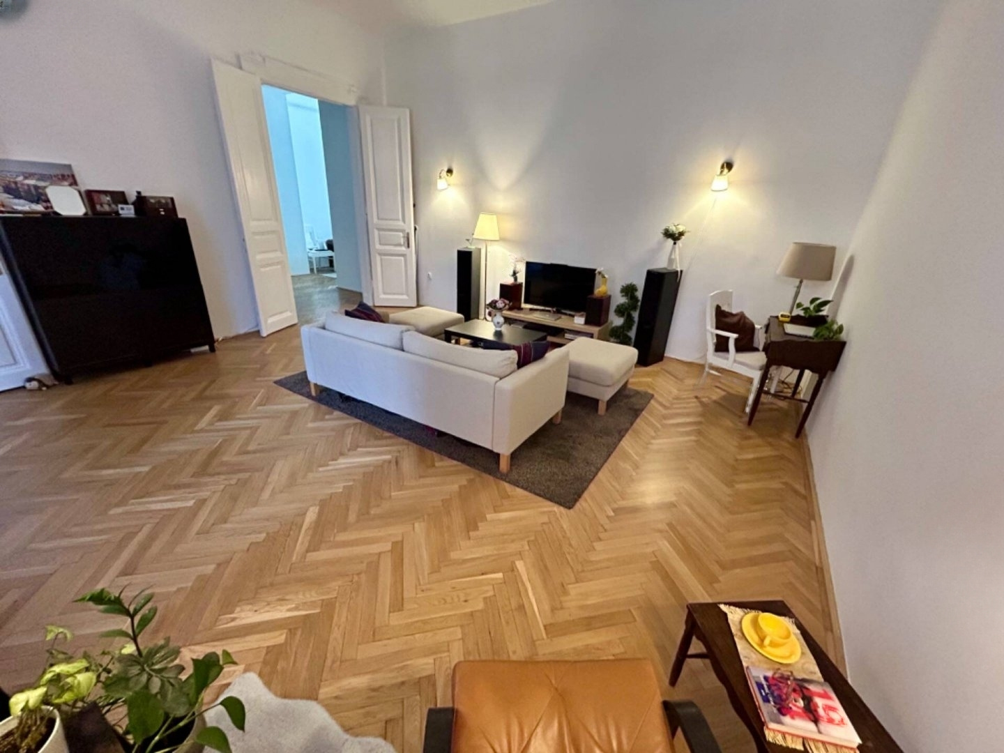 Located just a 2-minute walk from Nyugati Railway Station, this 89 m² apartment features 3 rooms plus a hall, and is air-conditioned with southern and western exposures. It's on the top floor of a classic building and is free of encumbrances.