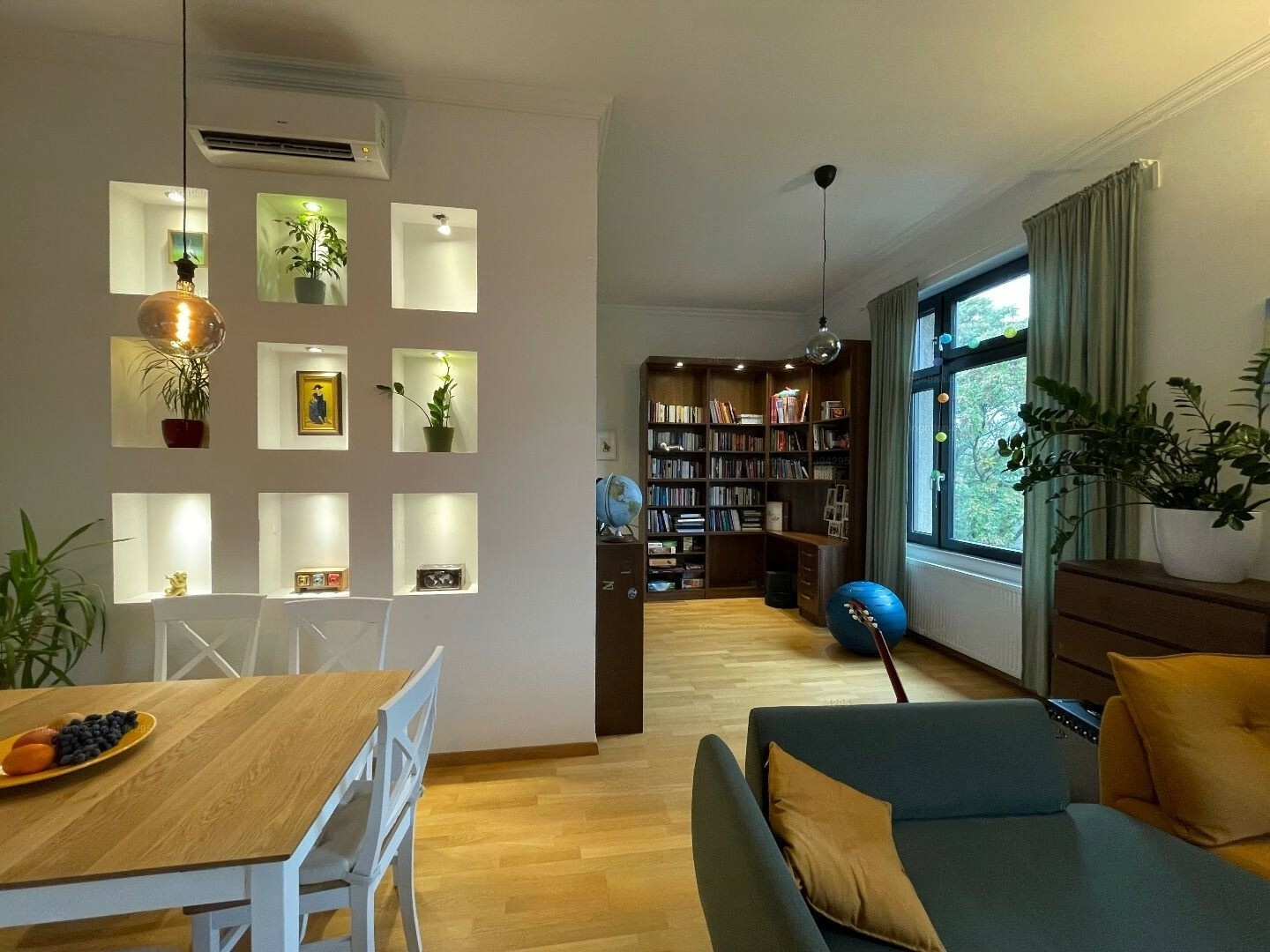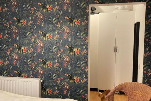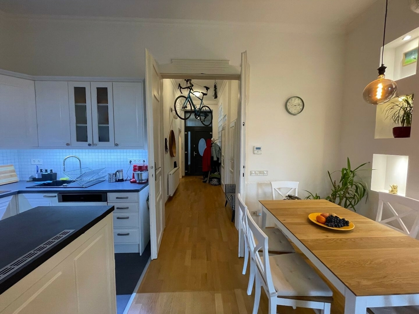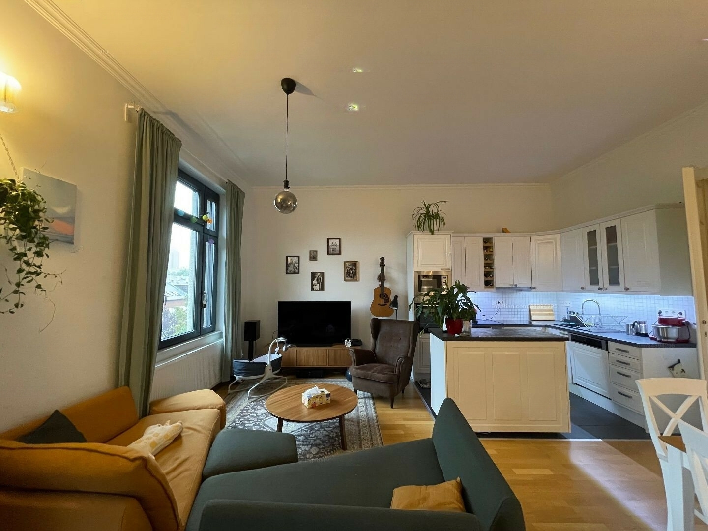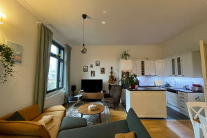 Entering from the impressive hallway, you find a large living room with an American kitchen, which features a separate sleeping alcove and wardrobe. The living room is bright and airy, with large, west-facing windows that allow for abundant natural light throughout the day.