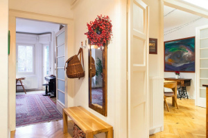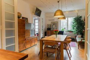 This beautifully renovated apartment features brass accents, new wooden windows, brass handles, and original parquet flooring throughout. The property boasts a partial view of the Danube, with windows facing a spacious green area, ensuring abundant southern sunlight—an uncommon find in Víziváros.