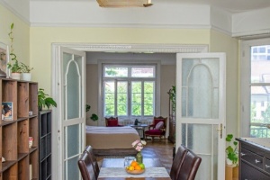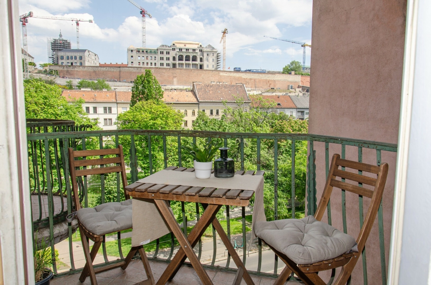 Property Description: This third-floor apartment, listed as 80 m² but actually 85 m² based on measurements, has 2 balconies. With a ceiling height of 340 cm, the apartment’s 2 rooms overlook the Budapest Castle, the boulevard, and Horváth Garden, while the small room’s window faces a quiet gallery/internal courtyard. The kitchen was completely rebuilt in 2013. The apartment is quiet in terms of neighbors: a dental office is located to the right and the side staircase to the left. Due to its elongated layout, it is ideal for couples, families with children, or even as office space.