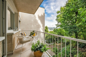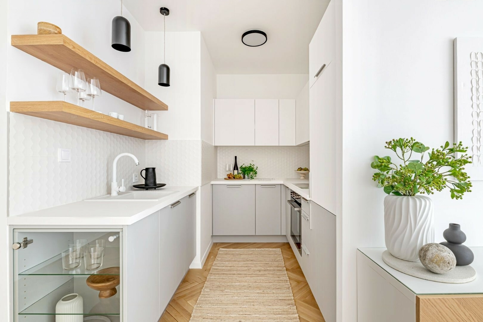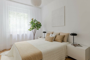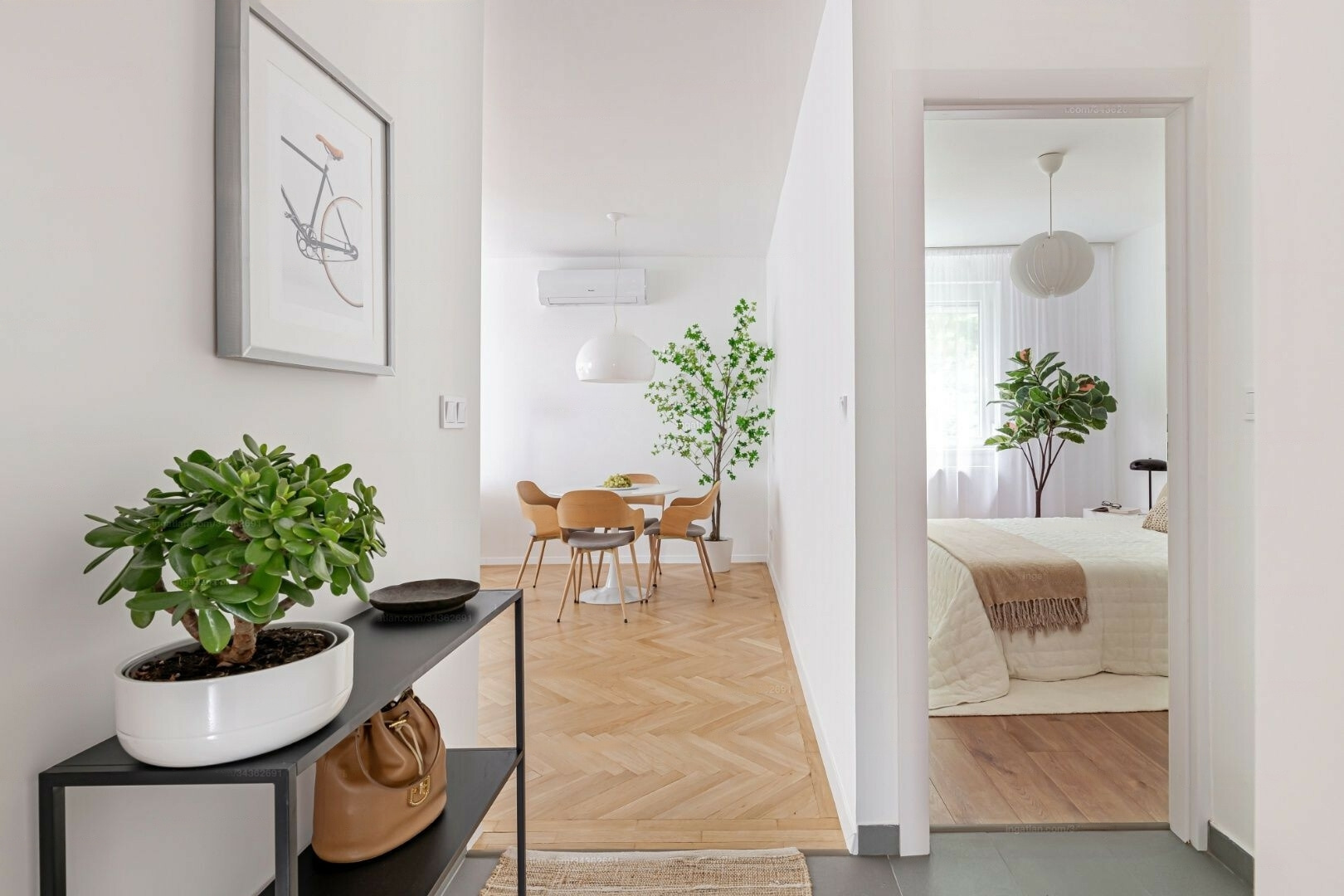The layout is efficient: a large built-in closet in the entryway offers storage, and the bedroom overlooks a quiet garden. The apartment includes a separate toilet and a modern bathroom with a custom vanity and shower. The second room works as a home office, guest room, or children's room. The living room with an open kitchen has windows facing trees, creating a peaceful, natural feel. The balcony offers a panoramic view of the Buda Hills.