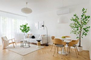 Common costs are 18,000 HUF per month, covering water usage. Gas and electricity are billed based on consumption. The air conditioner cools in summer and can also be used for heating, while a gas boiler ensures winter warmth.