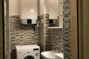 The room features laminated flooring, a built-in kitchen, and large, new windows. Hot water is provided by an Ariston electric boiler, and heating is ensured by a Mika gas boiler with underfloor heating. The apartment is equipped with a shower and a separate toilet, along with a lockable, dry storage area.