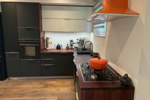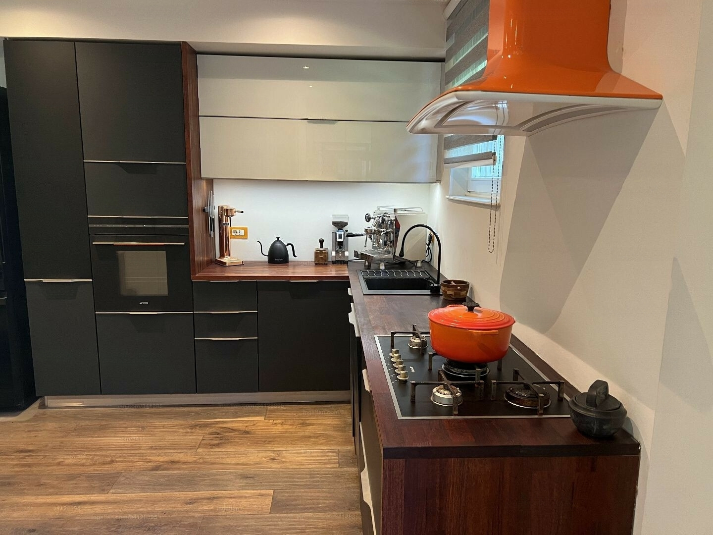 Included in the price are the built-in furniture—with premium finishes like tropical wood counters in the kitchen and oak-fronted wardrobes. High-end materials were used throughout, with brands like Gessi, Laufen, and Tres in the bathroom. For convenience, the apartment has remote-controlled heating, electric shutters, and an alarm system.