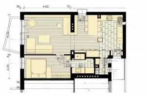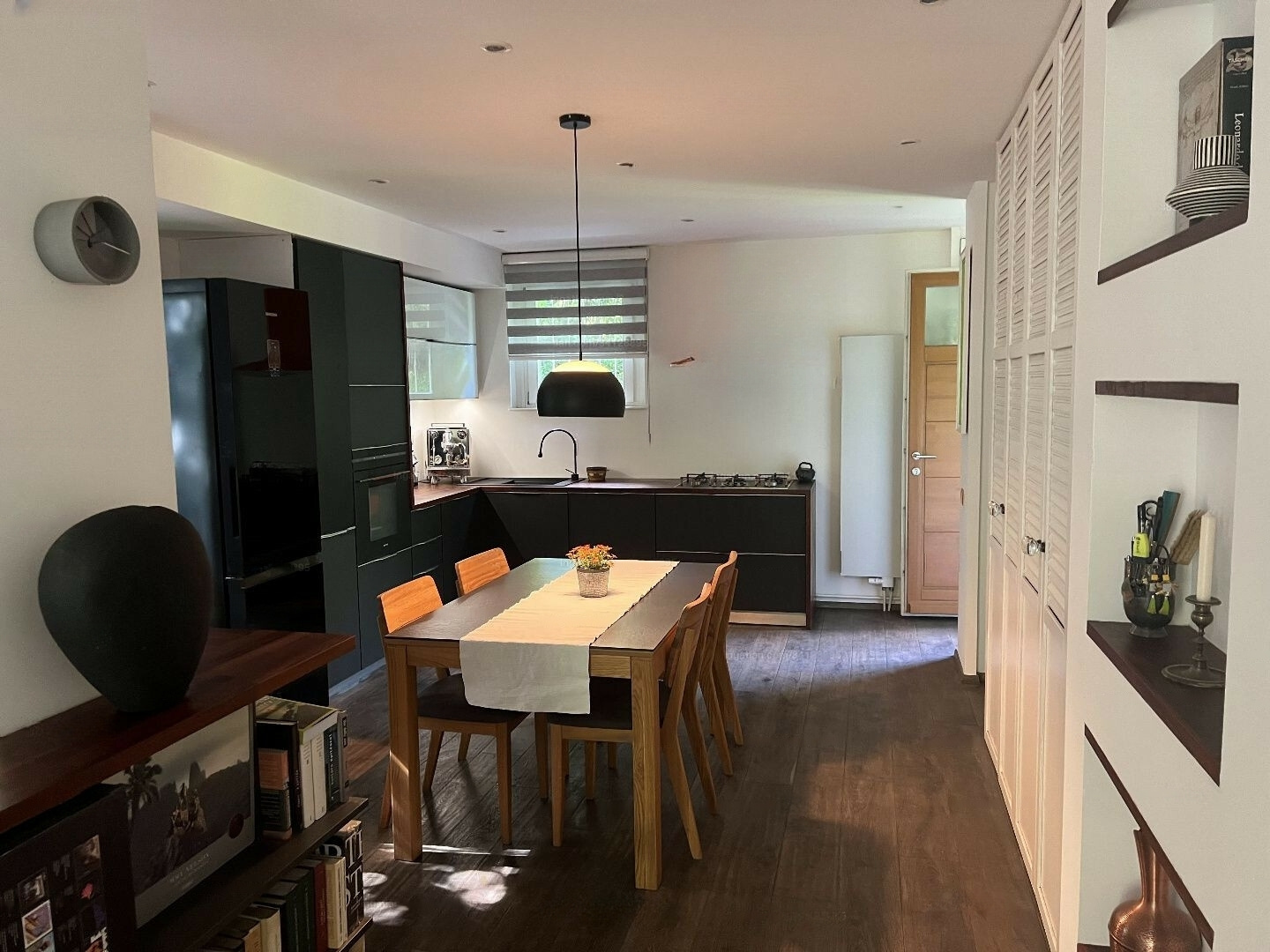 The interior is modern and open, featuring a living room, dining area, and kitchen in one space. There are separate rooms for the bathroom and WC, providing privacy. During the comprehensive renovation, key systems were updated, including the heating system, electrical setup, and windows/doors.