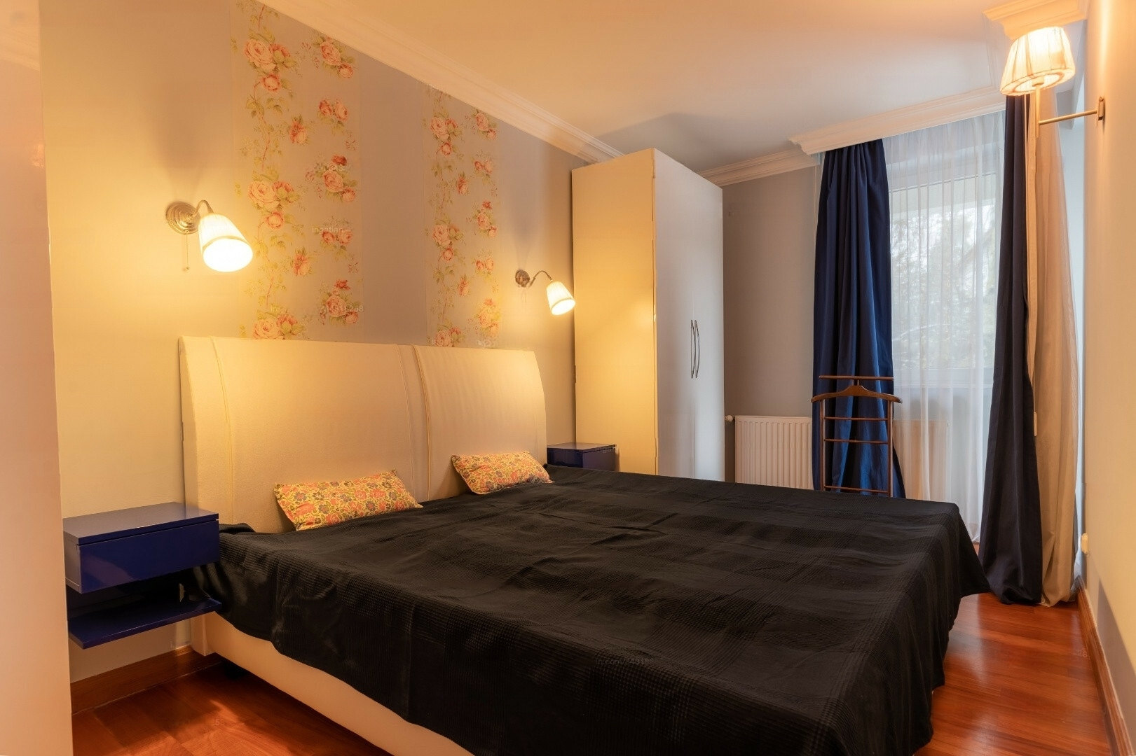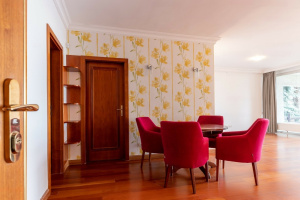 The garden-access apartment faces southeast, bathed in sunlight, with large glass surfaces overlooking the serene, tree-filled inner garden. In the evening, the city lights illuminate the living room. The apartment has been renovated and currently features 1 bedroom, a separate kitchen, and a bathroom. The living and dining areas are in a spacious 45 m² open layout, with a sliding door leading to a covered terrace offering stunning views from the Citadel to the Parliament. Both the bedroom and living room have direct access to the garden. The apartment can easily be converted into a 2-bedroom layout with an American kitchen or have additional work or sleeping areas separated off.