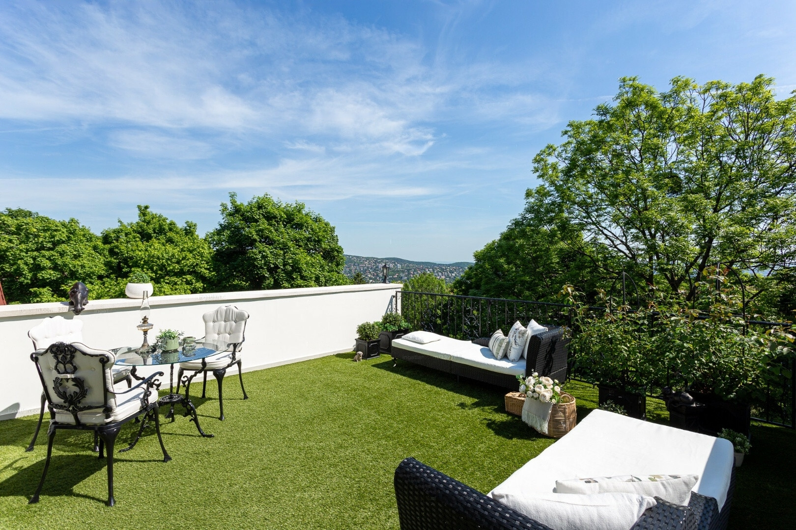 The panoramic terraces are covered with Dutch artificial grass, featuring cozy sunbeds, a breakfast table, tasteful decorations, and expertly arranged floral decor for deserved relaxation. The covered, spacious terrace opening from the living room is a true rarity, resembling a small garden that can serve as a pleasant social space.