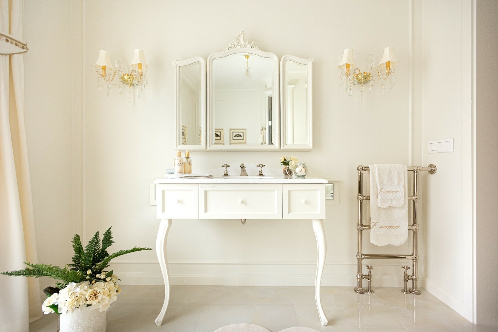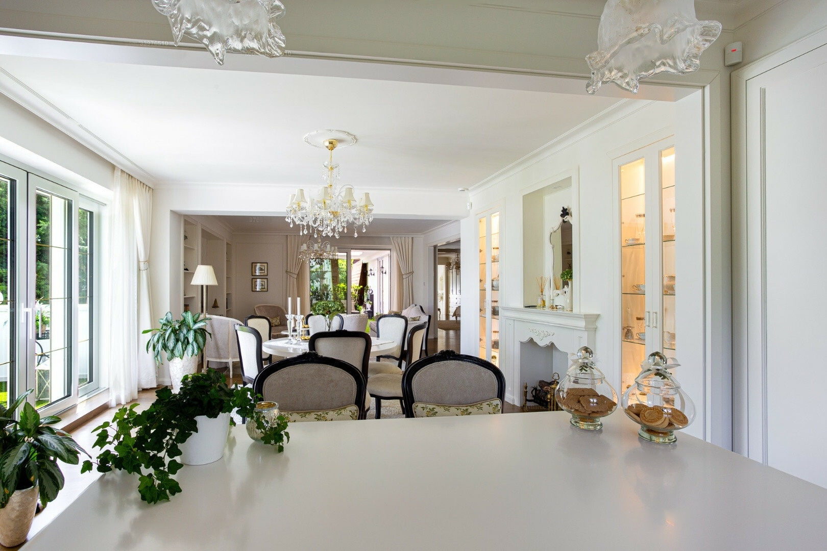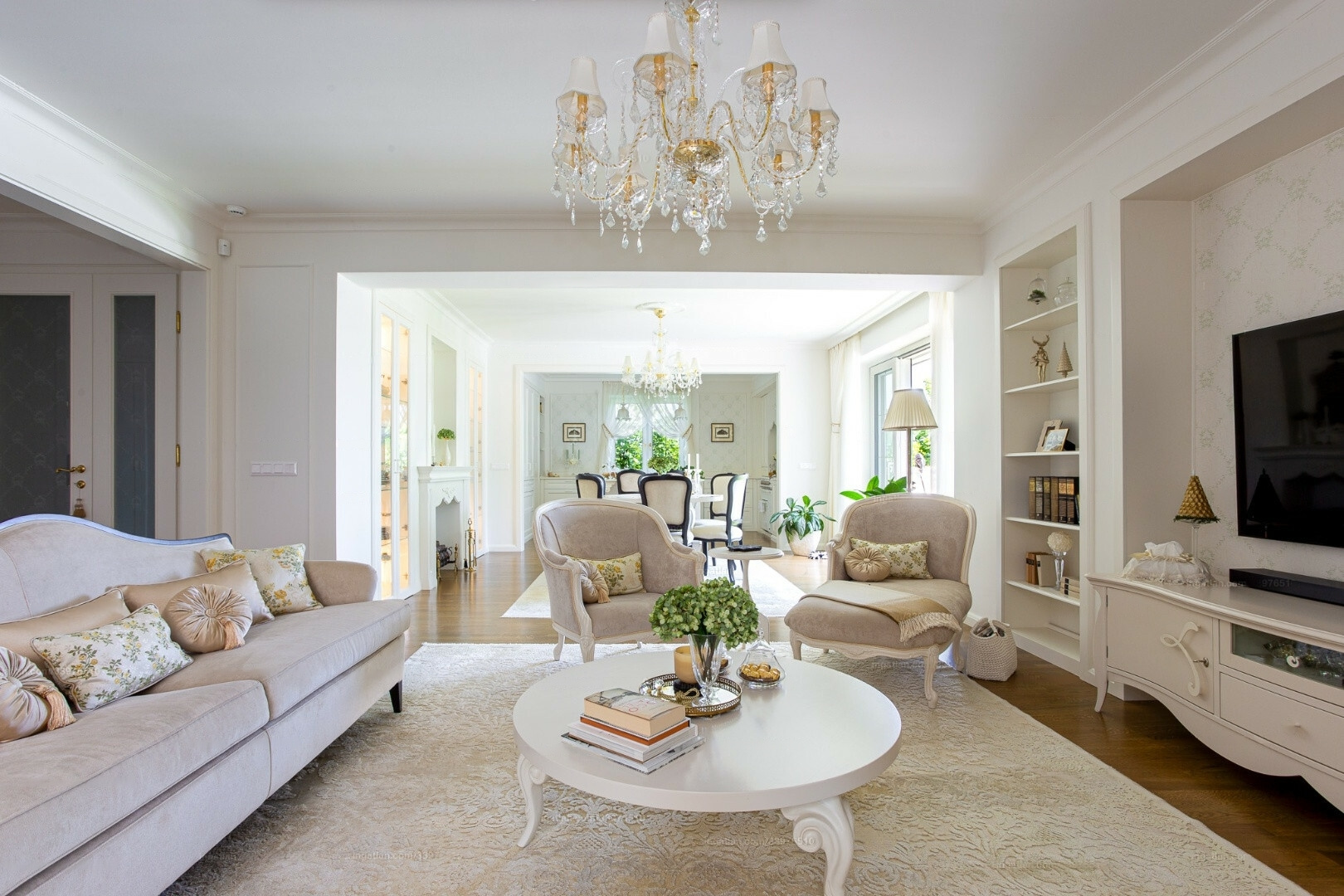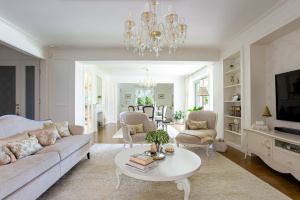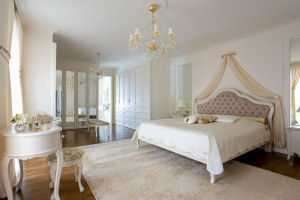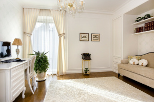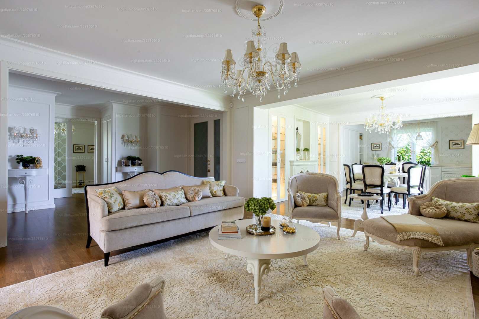 The apartment comprises two completely separate suites, each with a bedroom, walk-in closet, bathroom, living room, dining area, kitchen, office, laundry room, and four terraces. The furnishings are designed to meet all luxury needs, showcasing an elegant, modern-classic interior that reflects exceptional interior design and decor expertise.