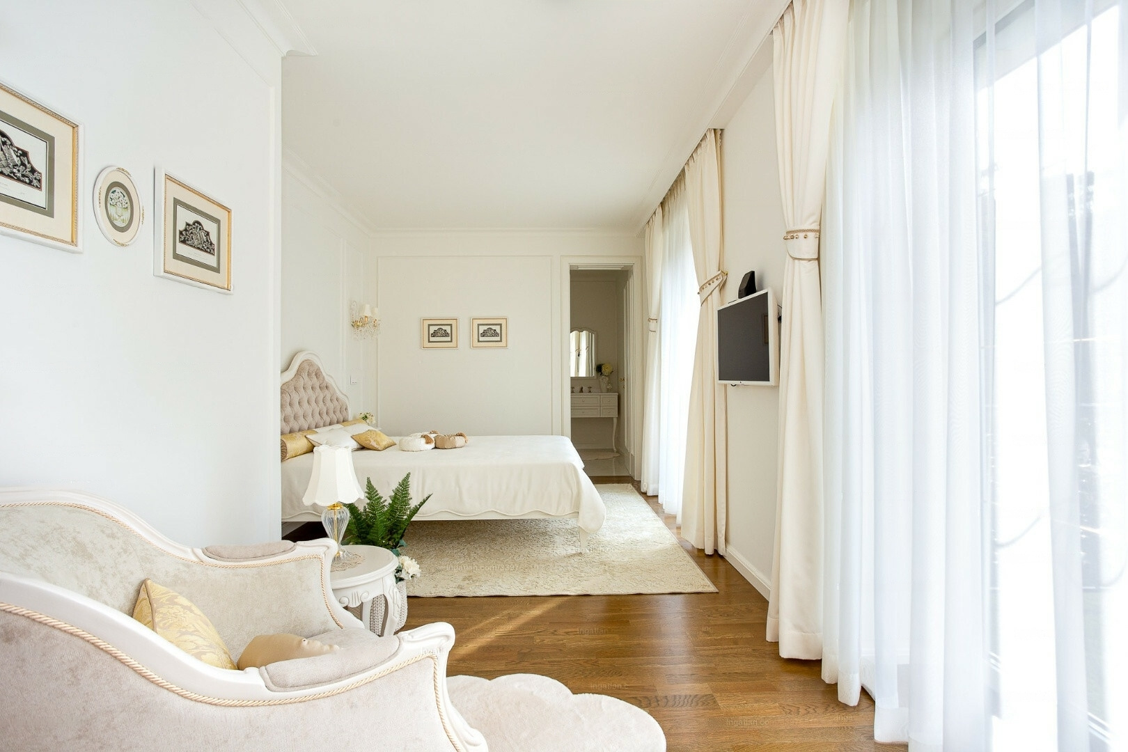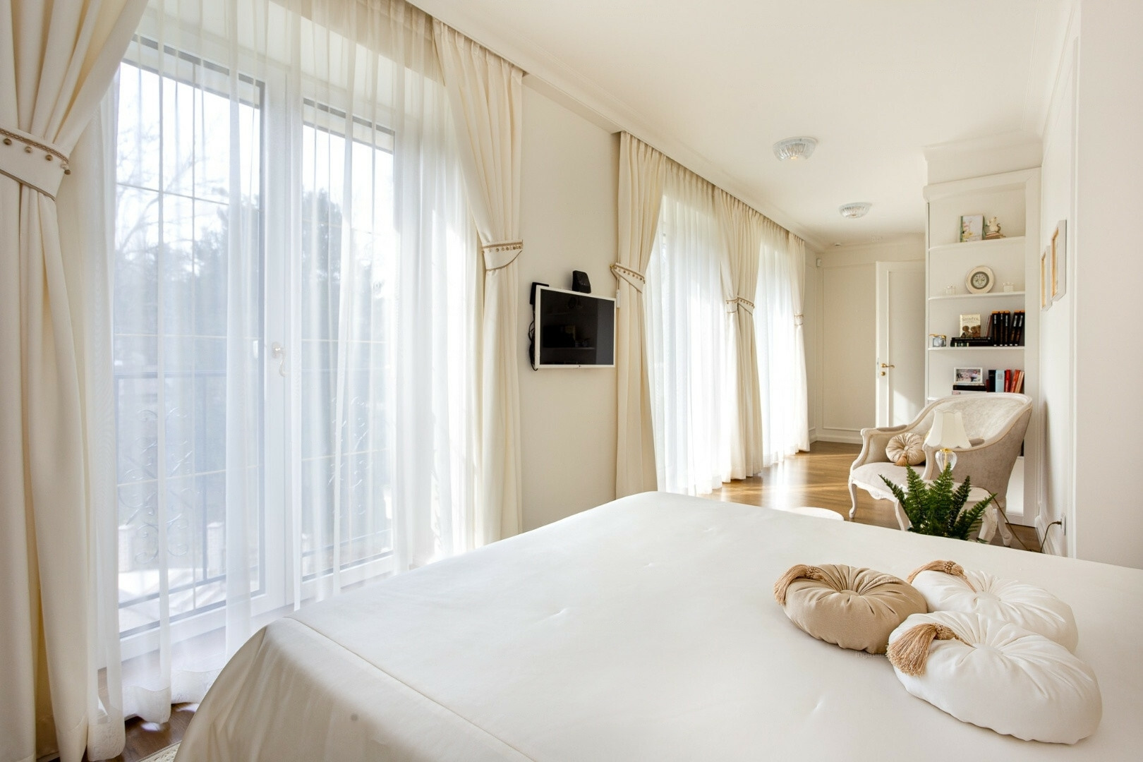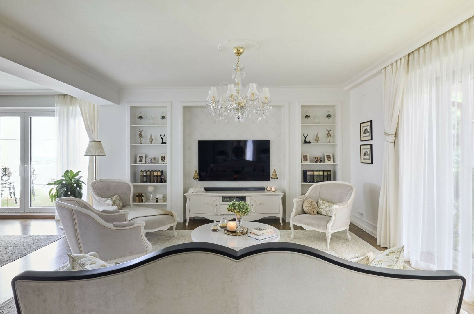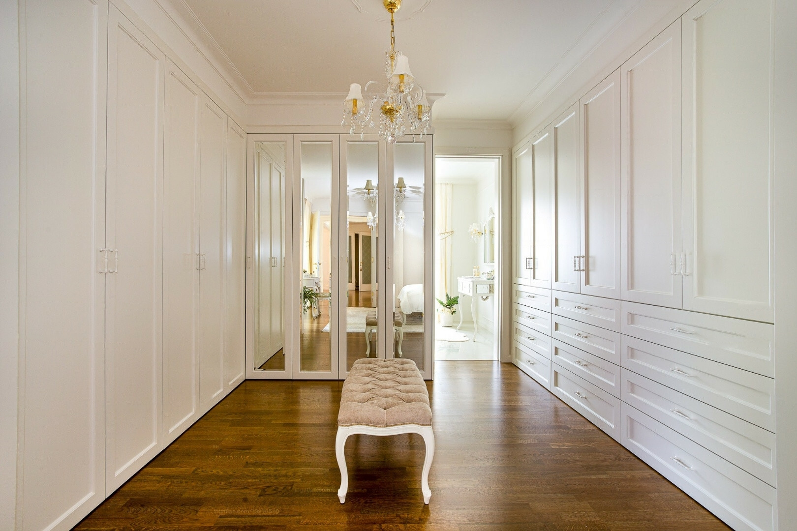 The apartment comprises two completely separate suites, each with a bedroom, walk-in closet, bathroom, living room, dining area, kitchen, office, laundry room, and four terraces. The furnishings are designed to meet all luxury needs, showcasing an elegant, modern-classic interior that reflects exceptional interior design and decor expertise.