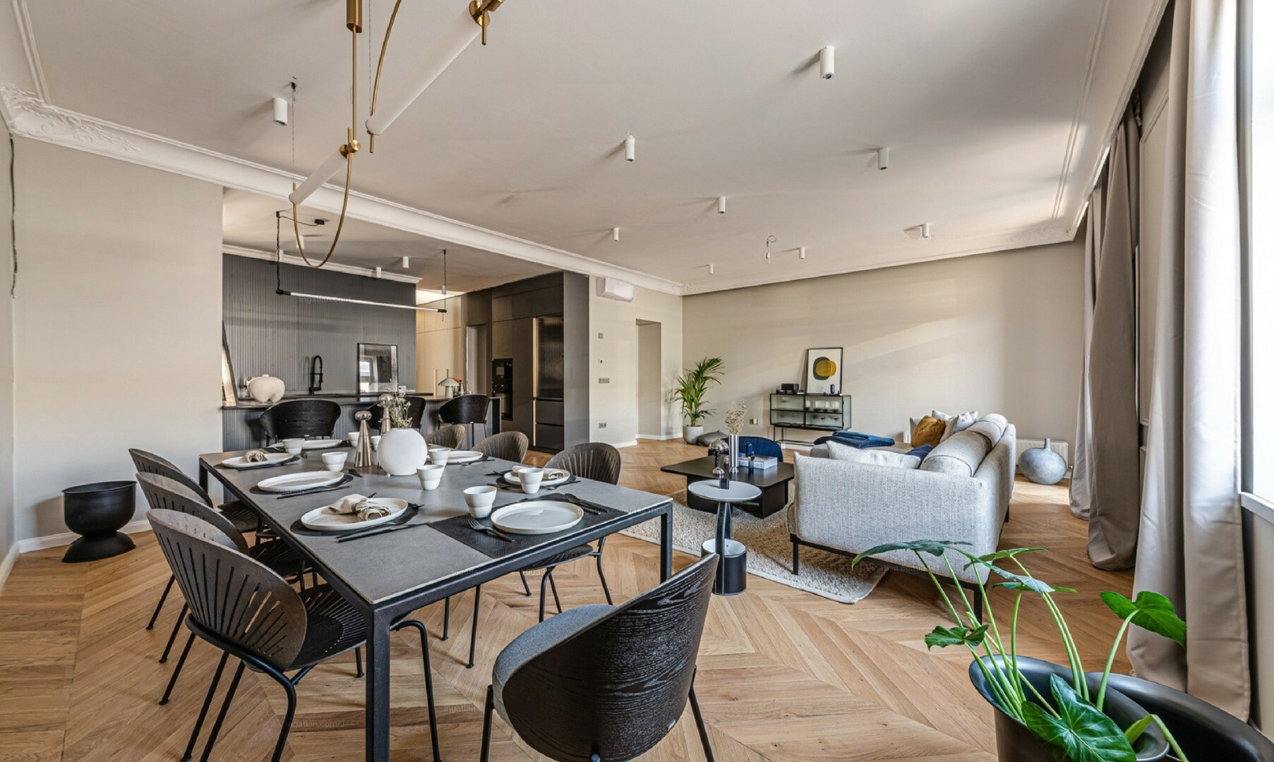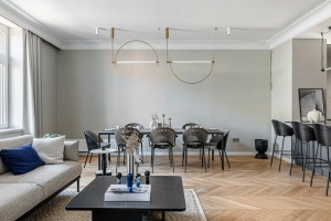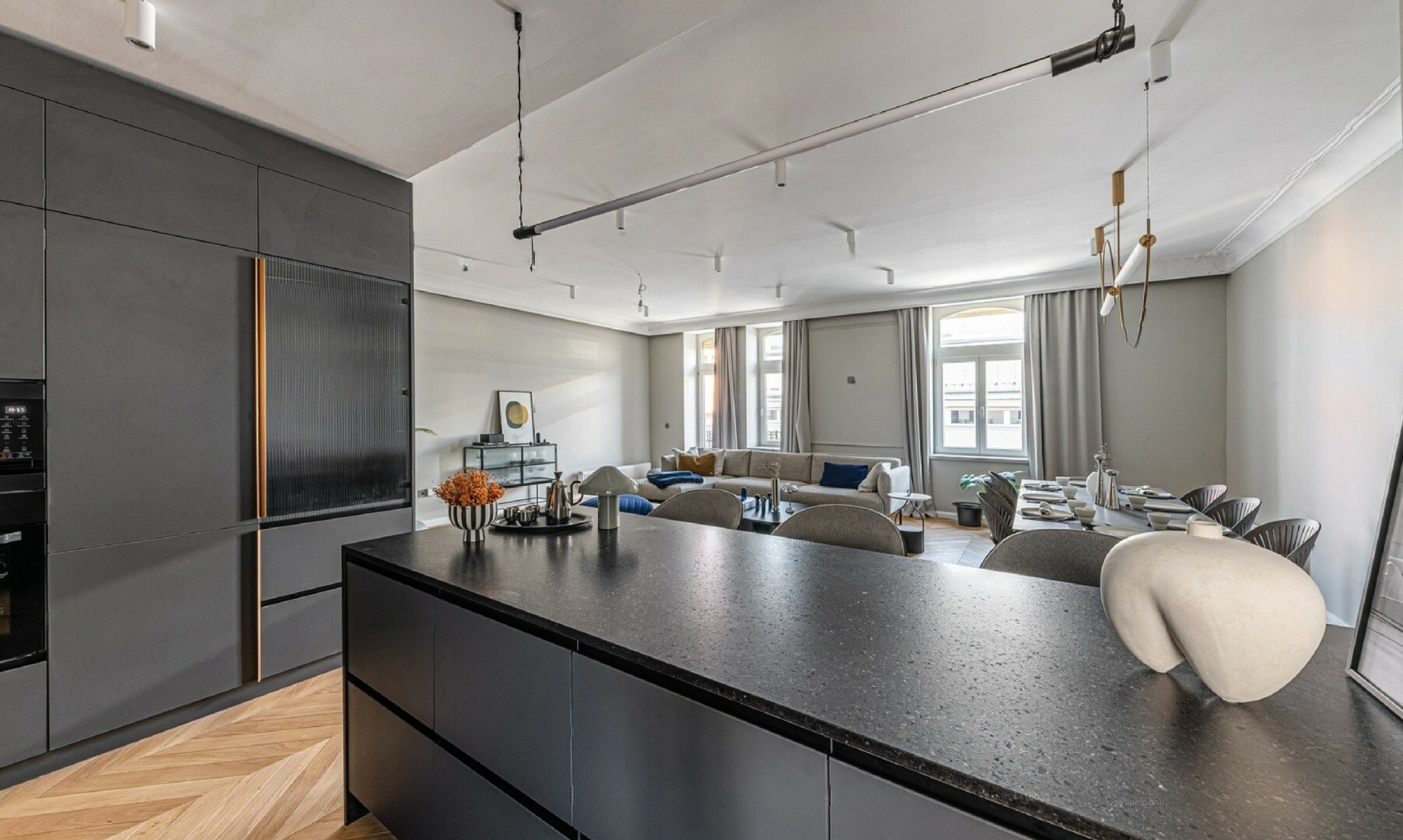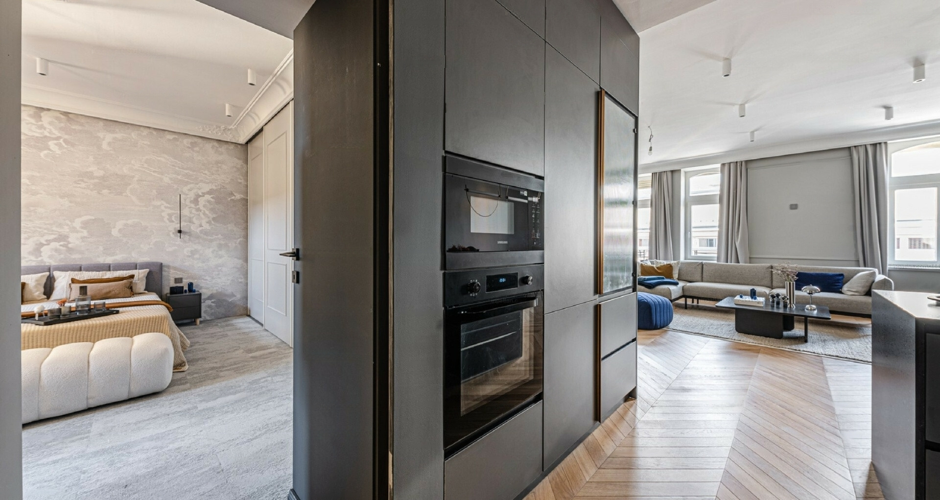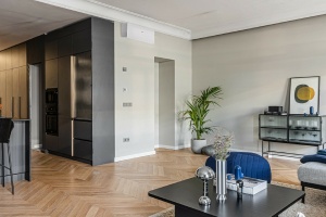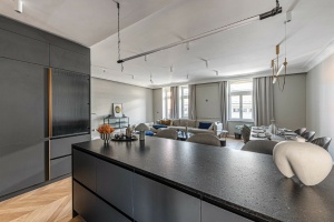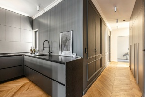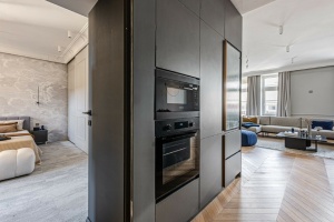 The design, crafted by a professional, provides a unique and stylish appearance. The custom-designed kitchen is equipped with high-quality appliances, while the hidden cabinets serve as sophisticated décor.