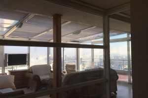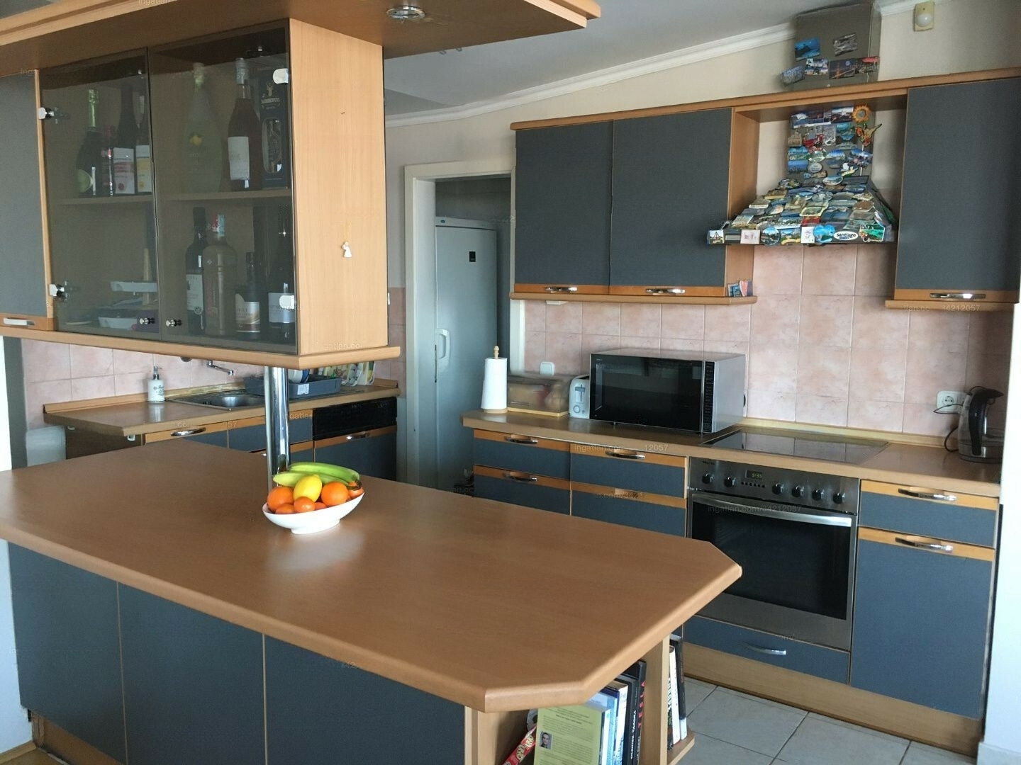 The current layout includes a spacious American kitchen with a living room, pantry, 2 bedrooms, 2 toilets, and a bathroom (98 sqm total), a winter garden (22 sqm), and an open terrace (50 sqm). Additional bedrooms can be added. The apartment underwent partial renovation 6 years ago.