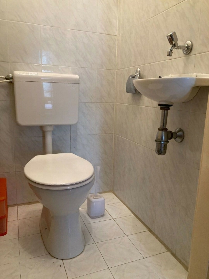 There is a separate toilet near the entrance, and a guest room with its own balcony, toilet, and shower. The kitchen has a large window facing the inner courtyard, and a pantry connects to it. At the back of the apartment is a medium-sized bedroom with a courtyard-facing window, leading to a bathroom with a window to the loggia.