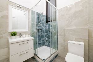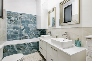 One bathroom has a shower and utility space, while the other has a bathtub and double sink.