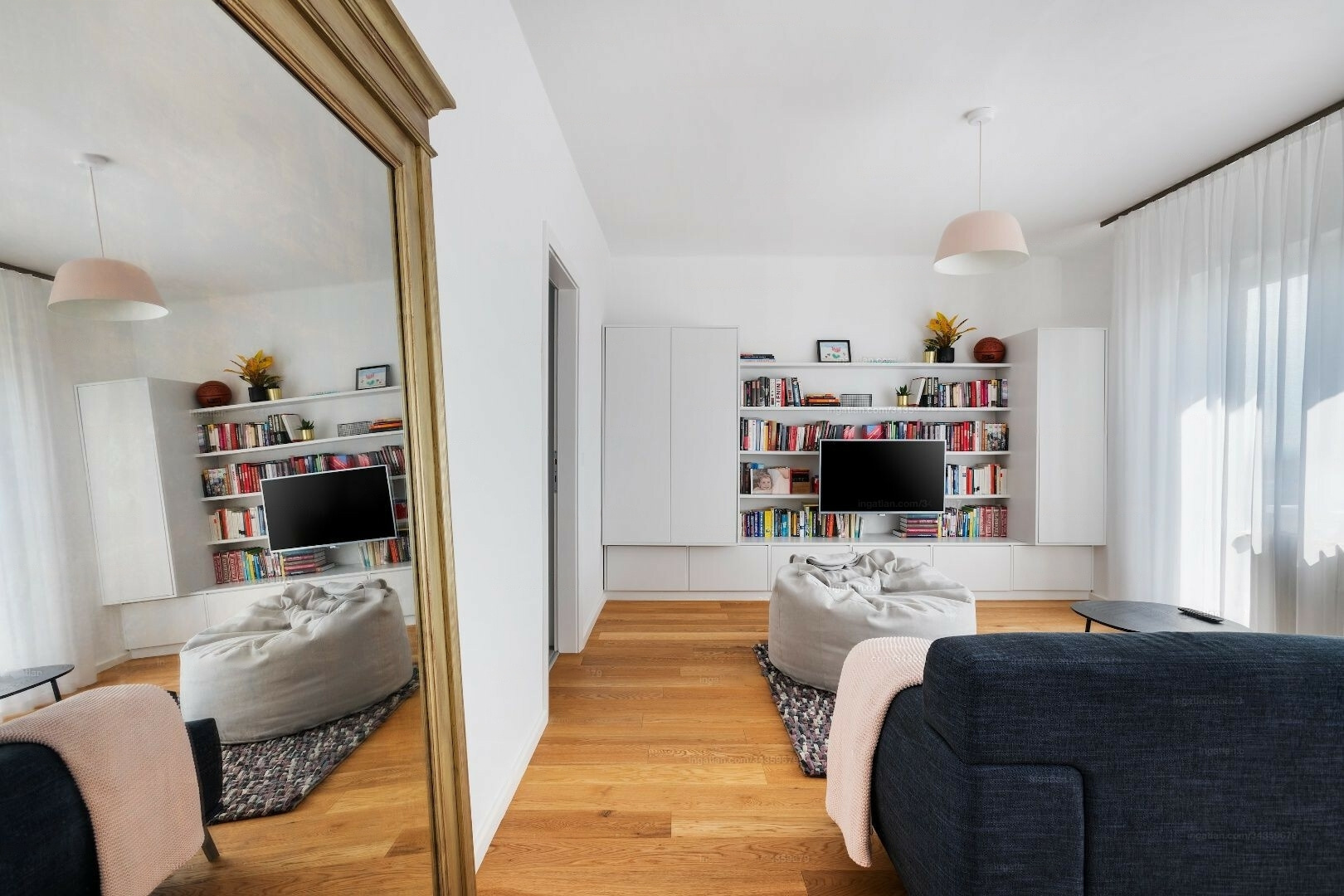 This renovated apartment with a panoramic view is for sale in a quiet neighborhood near the city center and Kis-Svábhegy Nature Conservation Area. The condominium sits on an 800 m² lot and was built in the 1960s. The area is peaceful, and the community is close-knit, reflected in the steady progress of the building’s renovations.
