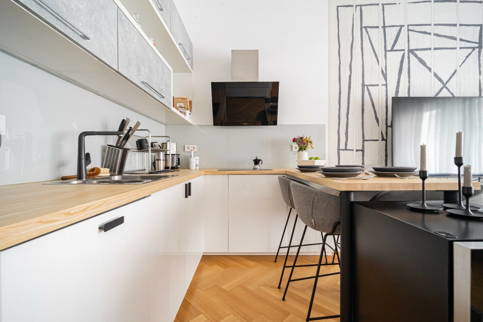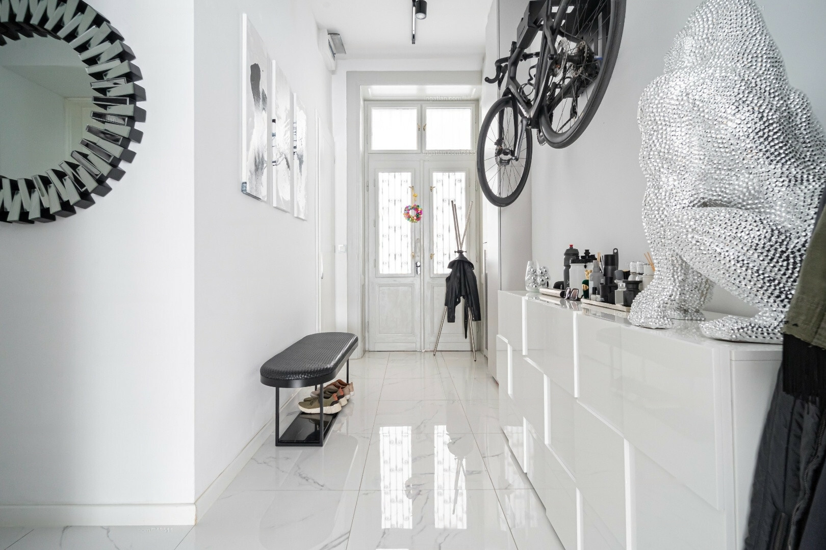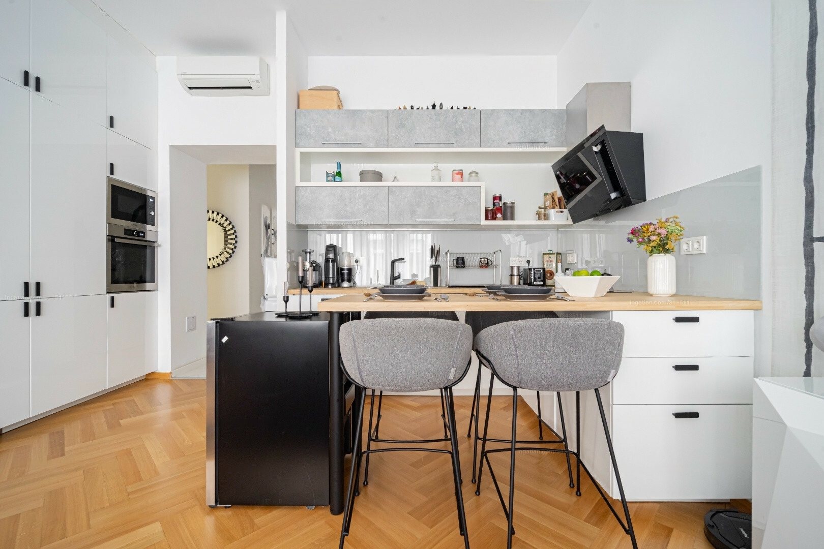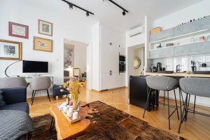In the 5th district, near Ferenciek tere, a beautifully renovated 66 m² design apartment with an American kitchen and living room is for sale on the 1st floor of a prestigious building with an elevator.