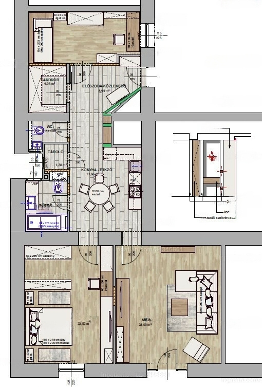 Built in the 1940s, the four-story building has 31 apartments and shops. The apartment is on the top floor (3rd level) and features a lift. The roof was recently renovated, with a monthly maintenance fee of around 30,000 HUF.