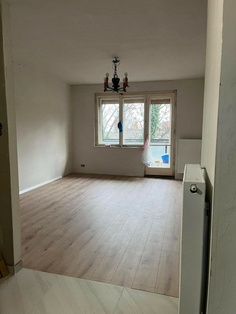 The kitchen is bright, with a large patterned floor and plumbing preparations (dishwasher and sink connections). The balcony is narrow but long, with the possibility of installing a larger balcony door in the future.